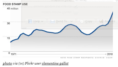 A new report by the United States Department of Agriculture states that 46 million Americans received benefits from the Supplemental Nutrition Assistance Program – We help put healthy food on the table for over 40 million people each month – in May of this year… That’s a record high, not to mention a 12 percent jump from last year at this time and a 34 percent jump from 2009 [8 August 2011].